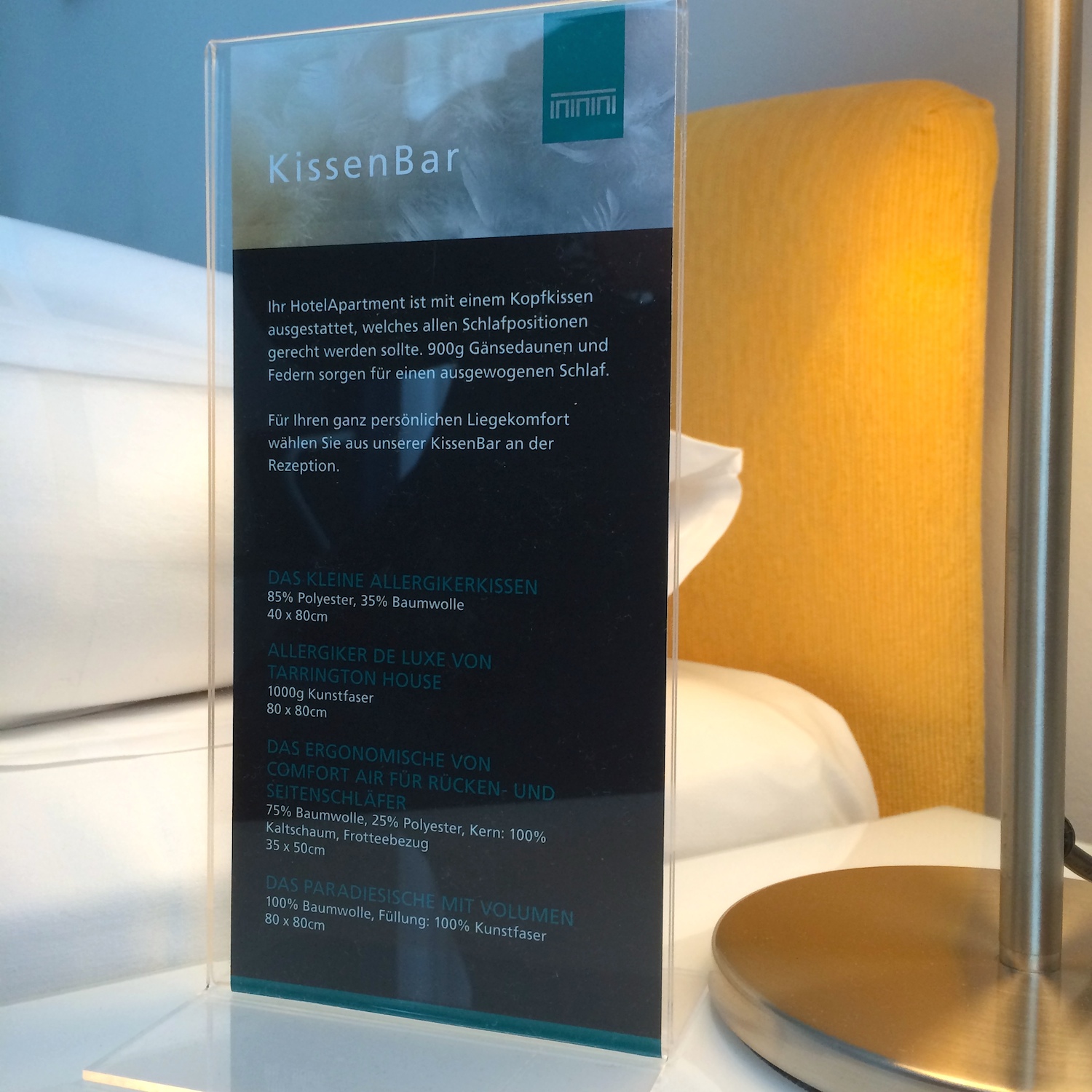 Auch beim Schlafkomfort wird auf Bequemlichkeit nicht verzichtet. Das ApartHotel setzt in seinen großen Betten fünffach Federkernmatratzen ein, die in Ergänzung mit einem an der „KissenBar“ individuell ausgesuchten Kopfkissen für einen angenehmen Schlaf sorgen. Gäste können hier zwischen verschiedenen Größen, Allergiker- sowie Seiten- und Rückenschläferkissen wählen.
