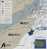 Das Team von Standard traf am 9. Februar vor Ort ein und zurzeit wird die erste Diamantbohrung seit mehr als 40 Jahren bei Corvo niedergebracht. Das Winterprogramm umfasst nach dem Abschluss der elektromagnetischen Zeitbereichs- und Boden-Gravitationsuntersuchungen sowie der geophysikalischen Modellierung im Vorjahr Bohrungen auf etwa 2.500 bis 3.000 m in vorrangigen Zielgebieten. Corvo umfasst ein Gebiet von 12.364 Hektar, verteilt auf 14 Mineralschürfrechte, die sich entlang von Highway 905 am östlichen Rand des Athabasca-Beckens befinden.