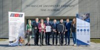 Der Ehrung wohnten auch Prof.?Dr.?Thomas?von Unwerth, Prorektor für Transfer und Weiterbildung sowie Inhaber der Professur für Alternative Fahrzeugantriebe, Prof.?Dr.?Alexander?Hasse, Prodekan für Forschung der Fakultät für Maschinenbau und Inhaber der Professur Maschinenelemente und Produktentwicklung, Paulin?Wels (Abteilung HCPS/WOT), Dr.?Roy?Morgenstern (Abteilung Chemische und galvanische Oberflächentechnik/WOT) und Sigrid Frey (Marketing/Kommunikation B+T) bei.