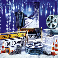 Eine ungewöhnliche und auffallende Dekovariante ist der vereiste Raum. Eiszapfen und Schneekristalle hängen von der Decke. Mit Schneespray besprühte Stühle, ein mit weißem Florgras umhüllter Tisch, vereiste Kerzenhalter, Tischlampen und Kaffeetassen sind von Eisblumen umgeben. Zusammen mit dem Textildruck „Altes Haus“ als Hintergrund entsteht eine filmreife Dekoration, die eisigen, faszinierenden Charme verströmt. Aber auch die winterliche Wirklichkeit kann ins Schaufenster geholt werden. Winterstraßen-Banner, Reifenspuren- bzw. Reifen-Displays, Eisblöcke und Scatterschnee bringen eine echte Straße in die Verkaufsräume. Sicherheitskegel und Straßensperren – Schilder machen die Illusion perfekt.