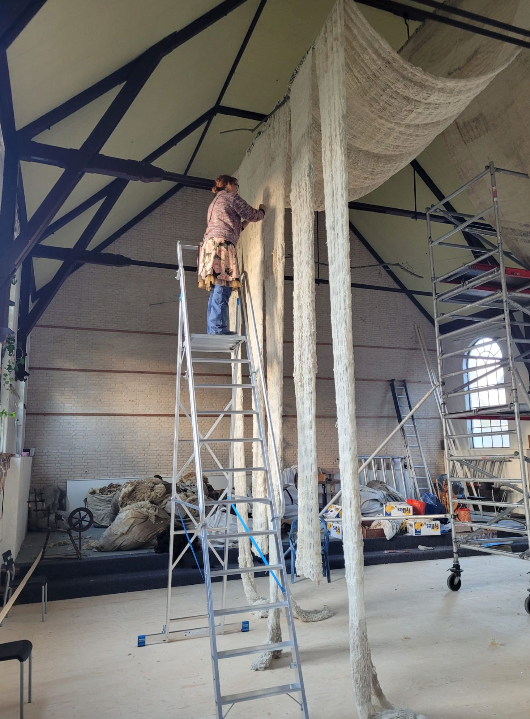 Als regionales Baumaterial für die einzigartige Wollkathedrale diente die Rohwolle von rund 150 Texeler Schafen. Sie wurde zunächst vor Ort gesponnen und danach per Stricknadel in neun Meter lange Bahnen verarbeitet. Insgesamt 48 dieser Wollpaneele entstanden auf diese Weise unter den Händen der fleißigen Helfer. Viele von ihnen stammen von der Insel, einige lieferten aber auch während ihres Besuchs auf Texel ihren Beitrag zu diesem einzigartigen Gemeinschaftsprojekt.