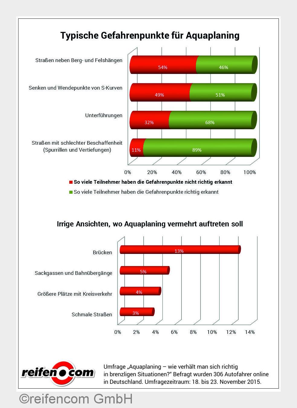 Im zurückliegenden Jahr hatten 59 Prozent der Autofahrer mindestens ein Aquaplaning-Erlebnis, 13 Prozent sogar dreimal oder öfter. Wo Aquaplaning vermehrt auftritt, dazu gibt es bei Autofahrern irrige Ansichten – wenn glücklicherweise auch nur bei wenigen. So meinen 13 Prozent, dass sie auf Brücken vermehrt damit rechnen müssen, Sackgassen betrachten 5 Prozent als einen möglichen Gefahrenpunkt. 4 Prozent halten „größere Plätze mit Kreisverkehr“ in dieser Hinsicht für gefährlich, weitere 3 Prozent „schmale Straßen“.