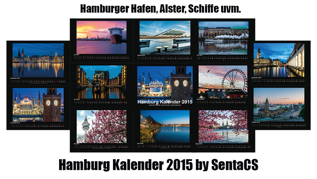 Der HAMBURG Kalender 2015 by SentaCS hat das Format Din A3 (42×29,7cm), beinhaltet neben dem Kalenderblatt 2015 auch die wichtigsten Feiertage und ist das perfekte Weihnachtsgeschenk für alle Hamburger und Hamburgliebhaber.