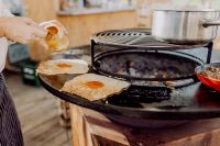 Gekocht wird draußen auf dem Ofyr-Grill über offenem Feuer, die Weinberge stets im Blick. Der Duft liegt in der Luft, das Knistern zieht die Gäste an. Vor ihren Augen entstehen frische Palatschinken. Das Produkt ist bewusst einfach, die Wirkung umso größer.