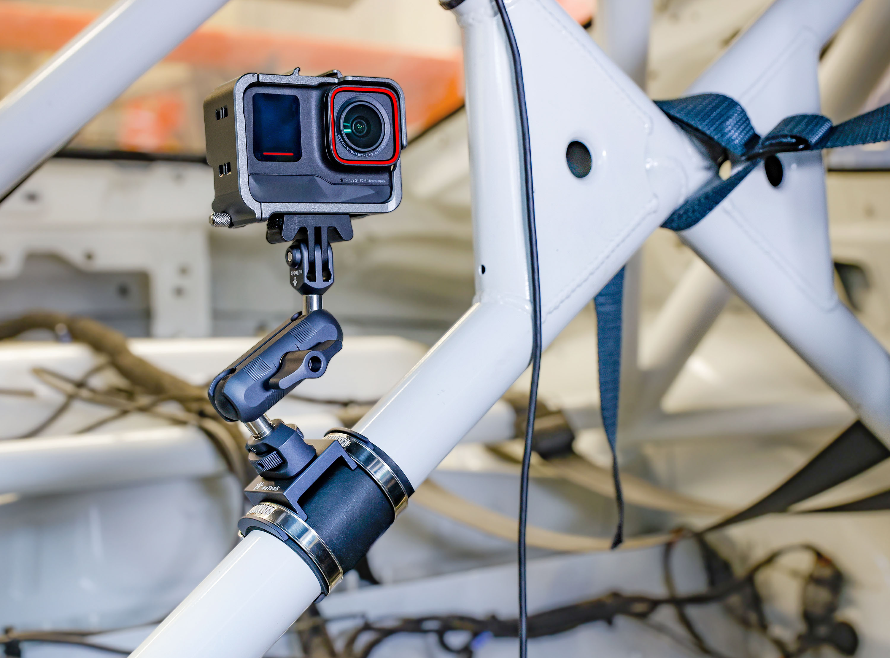 Der Racemount ermöglicht beeindruckende Aufnahmen direkt aus dem Fahrzeug. Dank Befestigung an Überrollkäfigen oder Rohren (Ø 32-40 mm) lassen sich Actioncams und Systemkameras sicher und flexibel positionieren.