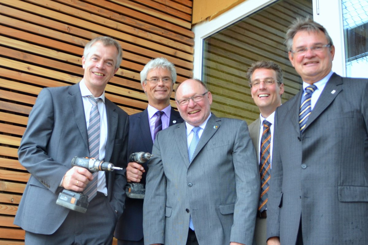 Nach dem traditionellen Richtspruch durch die Firma Grote Holzbau GmbH, welche die Holzbauarbeiten des Seebad-Gebäudes realisiert, griffen Umweltminister Johannes Remmel und Bürgermeister Albert Bergmann gemeinsam zum Schrauber. Sie befestigten einige Paneelen der Holzverkleidung am Seebad-Gebäude.