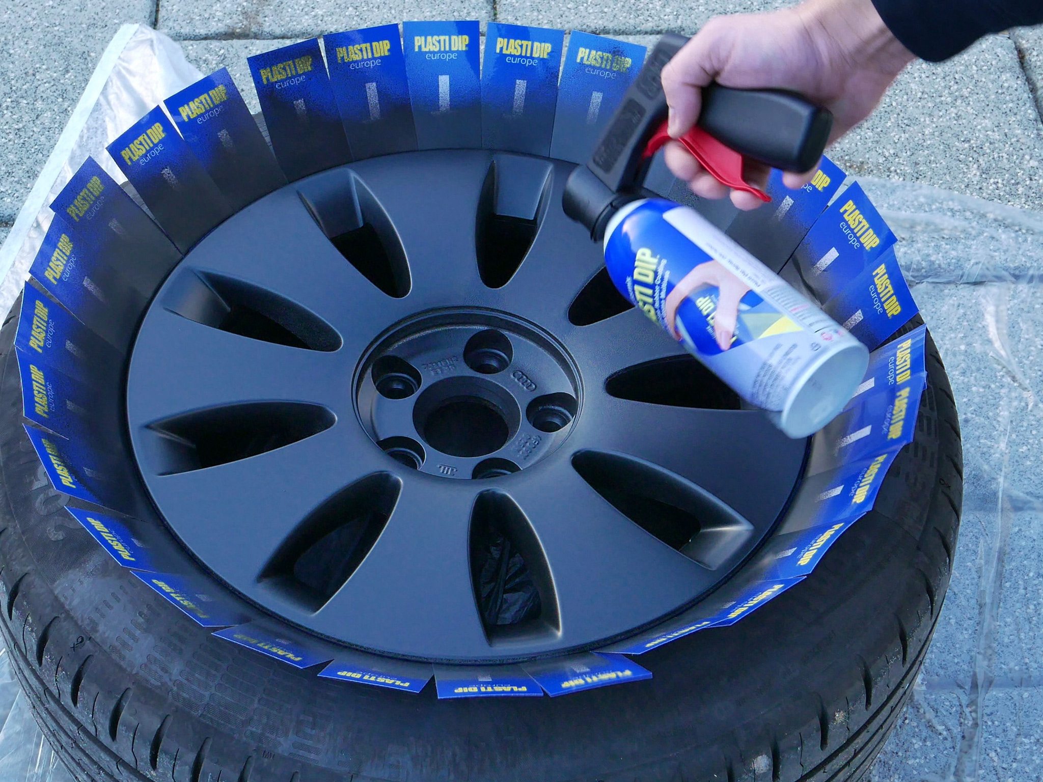 Das Besprühen der Felgen, das so genannte „Dippen“, ist relativ problemlos möglich. Dazu müssen die Reifen nicht demontiert werden, sondern nur die Felgen gründlich gereinigt. Das Aufsprühen sollte an einem trockenen Ort und nicht bei Kälte erfolgen. Mit den mitgelieferten Sprühkärtchen wird der Reifen vor Sprühnebel geschützt, sie werden wie ein Fächer zwischen Felge und Reifen gesteckt. Das Aufsprühen des Plasti Dips erfolgt in mehreren Schichten. Die Plasti Dip Felgenfolie lässt sich wie eine Farbsprühdose anwenden. Zwischen den einzelnen Schichten lässt man die Sprühfolie trocknen. Für einen individuellen Look kann man anschließend mit Plasti Dip Effektsprays weitere Farbtöne auftragen, so wie die neuen orangen oder saphirblauen Metalliceffekte von Plasti Dip.