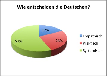 Obwohl bei Männern und Frauen die systemische Denkweise vorherrscht, ist diese bei den Frauen mit 58,3% stärker vertreten als bei den Männern mit 50,8%. Diese haben mit 31,6% ein stärker praxisorientiertes Denken als die Frauen, mit 24,5%. Die Empathie ist bei beiden Geschlechtern mit 17-18% vertreten. Wozu ist es wichtig zu wissen, welche intuitive Denkpräferenz eine Person besitzt?