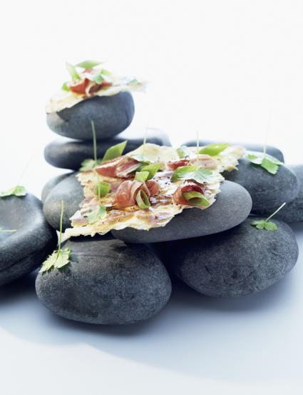 Schinken eng aneinander liegend belegen. Auf einem 250°C heißen Stein