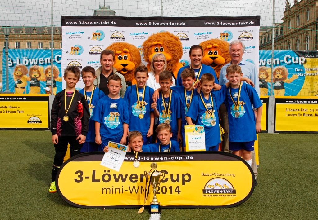 Am 05. und 06. Juli 2014 verwandelte der 3-Löwen-Takt, die Landesmarke für Bus, Bahn und vernetze Mobilität in Baden-Württemberg, den Schlossplatz in eine Fußball-Arena. Im WM-Jahr 2014 wurde der 3-Löwen-Cup wieder als mini-WM ausgespielt. Jeder der 32 Mannschaften, die beim großen Finale mitspielten, wurde ein WM-Teilnehmerland zugelost. Und so kam es, dass die Hohbuchschule aus Reutlingen Ghana und die Breit-Eich-Grundschule Japan vertreten haben und diese Nationen nun durch die Schülermannschaften aus Baden-Württemberg einen Titel erkämpft haben.