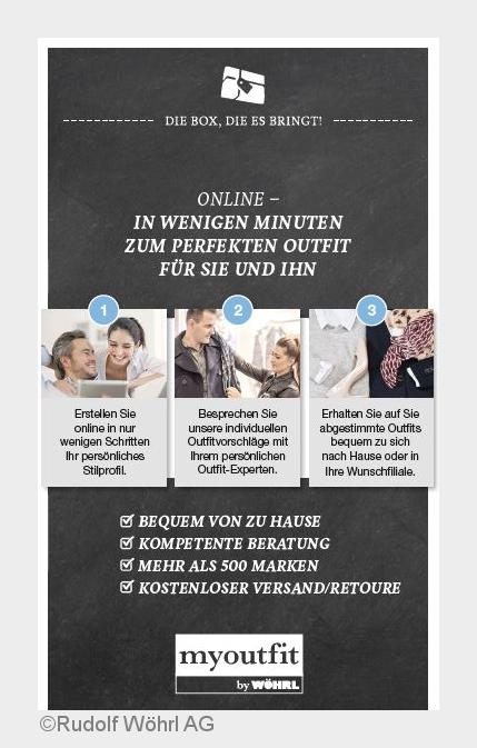 Die WÖHRL myoutfit-Experten nehmen sich für jeden Kunden Zeit, um bei einem persönlichen Gespräch am Telefon dessen modische Interessen sowie Vorlieben in Erfahrung zu bringen und kennenzulernen. Dabei zählt die bei WÖHRL gelebte Divise: Nur wer gut zuhört, kann die modischen Bedürfnisse seiner Kunden erfüllen. Darüber hinaus bietet WÖHRL die Option einer modischen Beratung bei einem Personal-Shopping-Termin in einem der 36 Modehäuser.